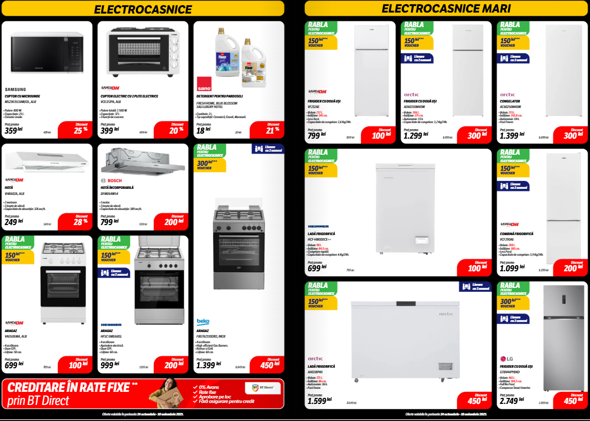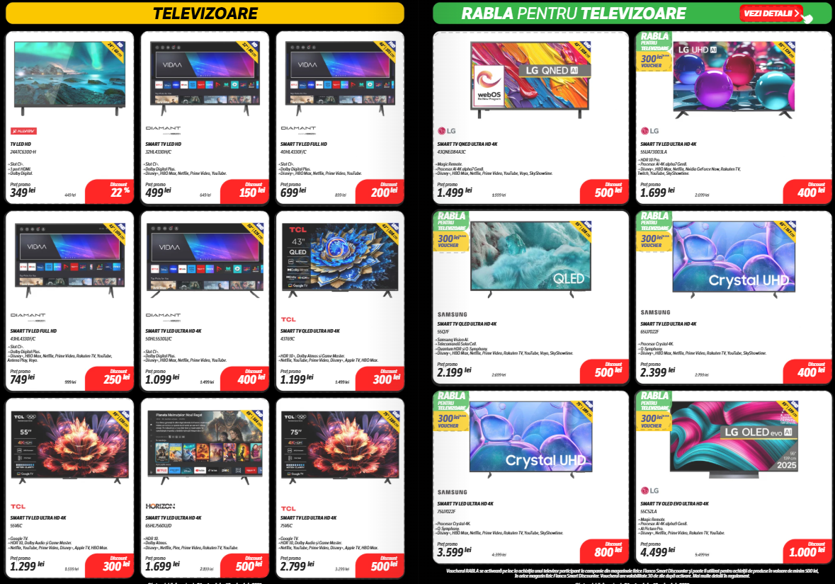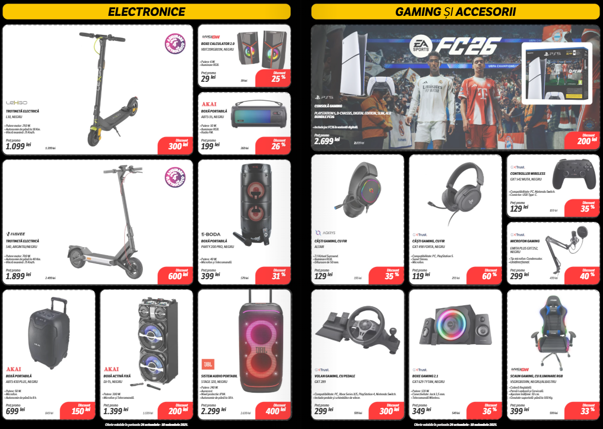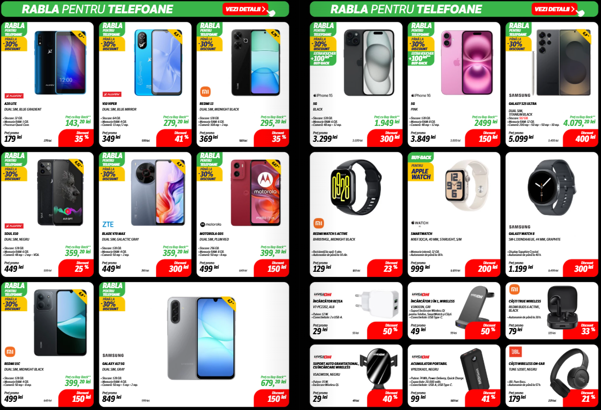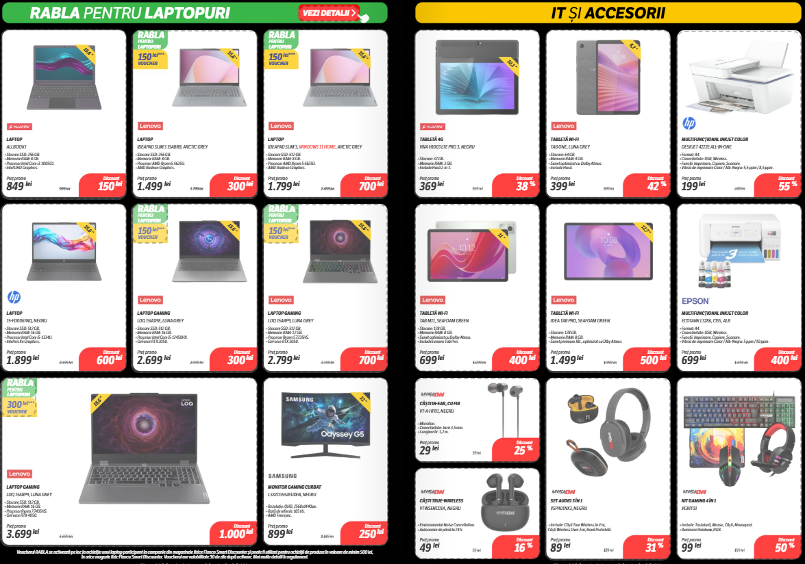 Catalogul include secțiuni bine delimitate pe categorii: electrocasnice, gaming, telefoane, laptopuri, dar și accesorii IT sau televizoare, unde unele discounturi trec lejer de 40%. Mai jos, am selectat câteva produse care ies în evidență prin preț sau reducerea aplicată.