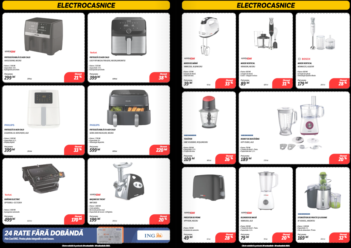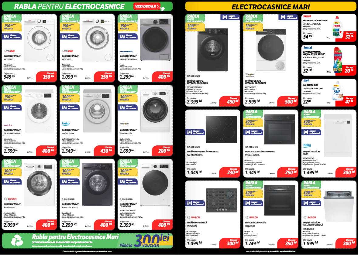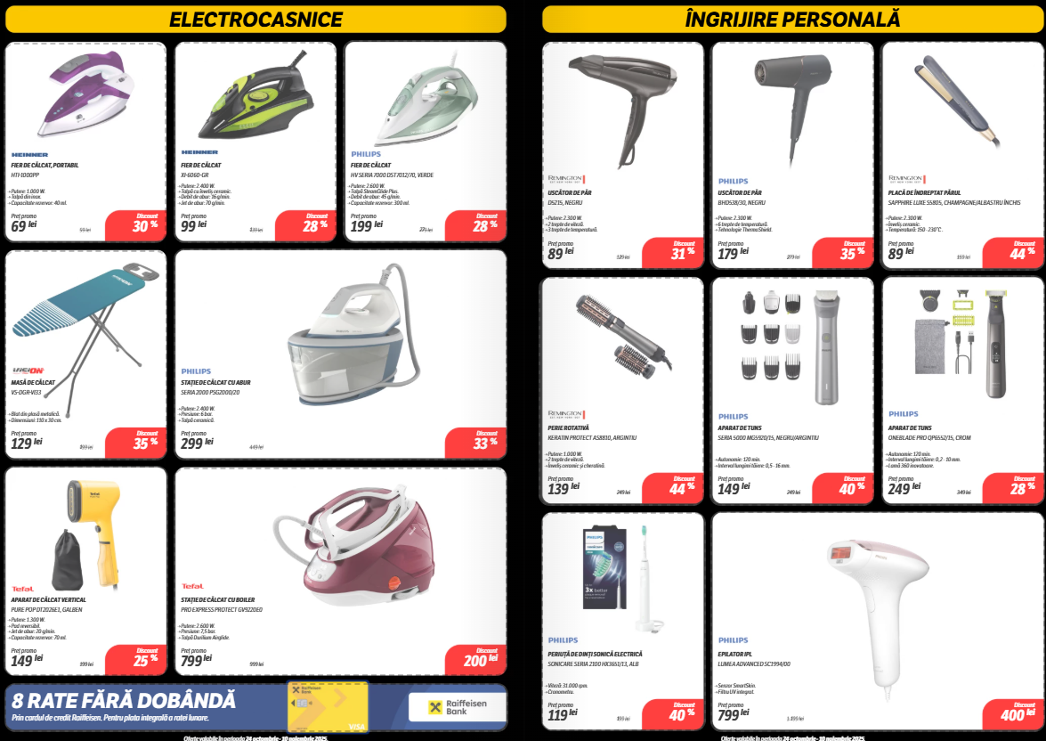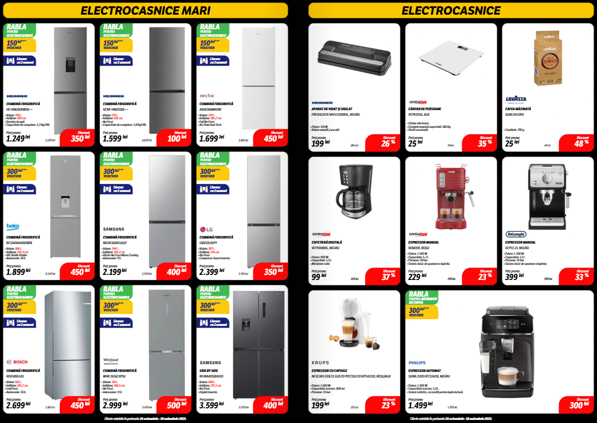 Catalogul include secțiuni bine delimitate pe categorii: electrocasnice, gaming, telefoane, laptopuri, dar și accesorii IT sau televizoare, unde unele discounturi trec lejer de 40%. Mai jos, am selectat câteva produse care ies în evidență prin preț sau reducerea aplicată.