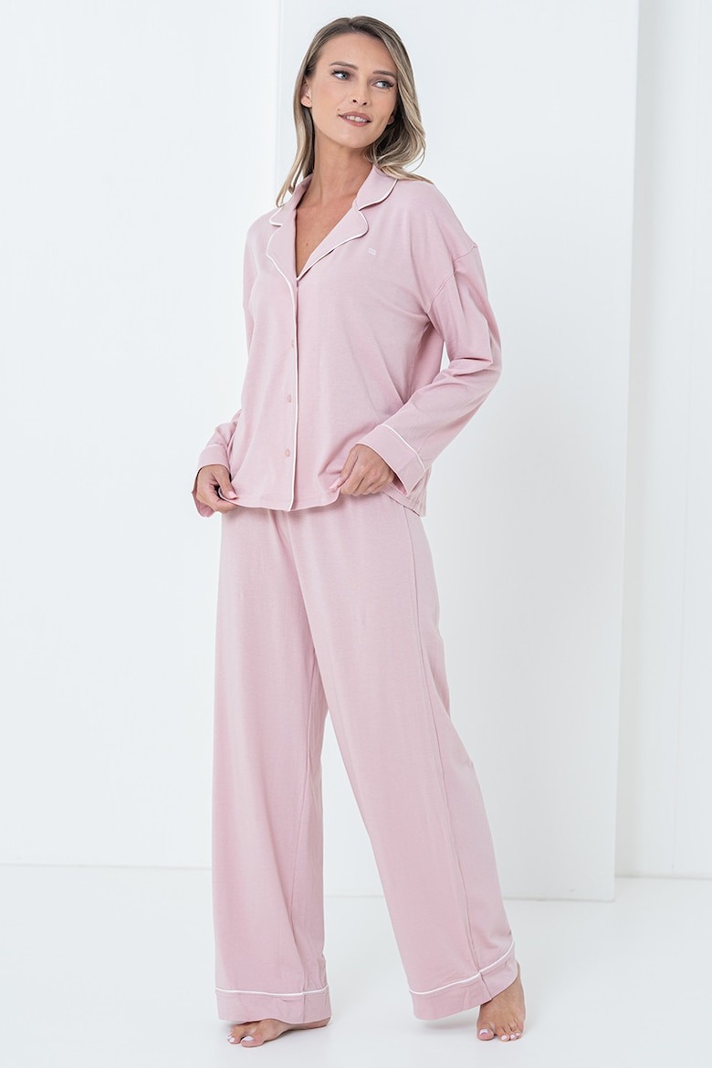 Pijamaua Tommy Hilfiger din amestec de modal și bumbac organic cu pantaloni lungi este acum 429,99 lei pe Fashion Days, redusă cu 19% față de prețul inițial de 534,99 lei. Este lejeră, cu nasturi și revere decupate, perfectă pentru confortul de seară. Disponibilă în roz somon și negru. Profită cât încă e în stoc! 😴🛏️🎀