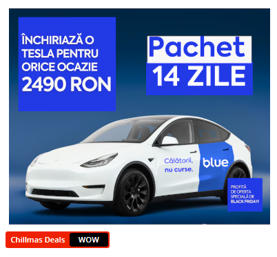 Ai 14 zile de închiriere a unei Tesla prin Blue valabile până la 31.12.2026, iar prețul scade masiv: de la 7.389 lei la doar 2.490 lei, adică o reducere de 66% față de prețul recomandat. Dacă ai visat să conduci o Tesla, acum e momentul – oferta e disponibilă pe eMAG, dar nu va sta mult pe stoc! ⚡🚗📆