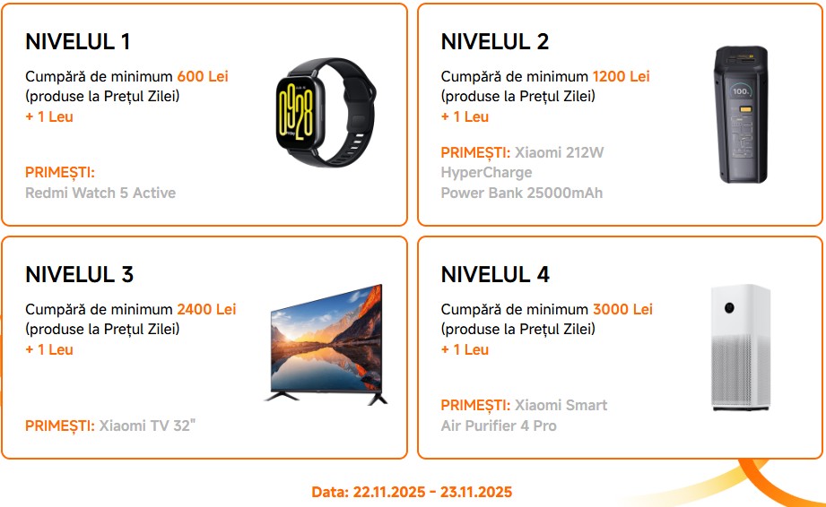 Toate aceste oferte sunt disponibile strict în magazinul Xiaomi Store din ParkLake București și doar în perioada 22–23 noiembrie 2025, în limita stocului disponibil. Nu pot fi cumulate cu alte promoții și sunt valabile o singură dată per client.