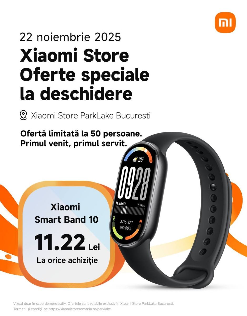 Pe 22 noiembrie 2025, Xiaomi inaugurează oficial noul său magazin fizic din ParkLake Shopping Center, București. Cu ocazia deschiderii, compania lansează o serie de oferte speciale disponibile exclusiv în magazin, iar una dintre cele mai spectaculoase este vânzarea brățării Xiaomi Smart Band 10 la prețul simbolic de 11,22 lei, valabil pentru primele 50 de persoane care ajung la fața locului și fac o achiziție – indiferent de valoare. Nu se fac rezervări și nu există liste de așteptare. Principiul este simplu: primul venit, primul servit.